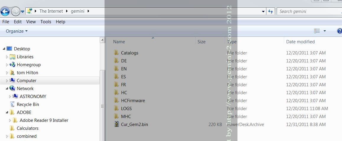 The Format selection will completely wipe out the micro-SDcard of all if its files. Once that is done, you can reload the files by putting them in the HCFirmware directory of the main units micro-SDcard, and then hitting Upload Files. When you select format SD card another screen will come up asking if you are sure, No or Yes. The Delete File button will bring up the list of catalogs and any other file stored in the catalog directories. You can only delete whole catalogs, not the individual entries in them. The reason for this is that a catalog is really a single file. You can also use this Upload Files to upload additional catalogs to the hand controller. You can create your own custom catalogs and upload them this way. The easiest way to do this is use the Windows File Explorer in an FTP mode. Do this by typing ftp://admin@gemini into the file manager bar at the top of Windows explorer. (not an Internet browser) If you have your Gemini-2 connected to your computer via Ethernet, then you should see the contents of the G2 main micro-SDcard contents. |